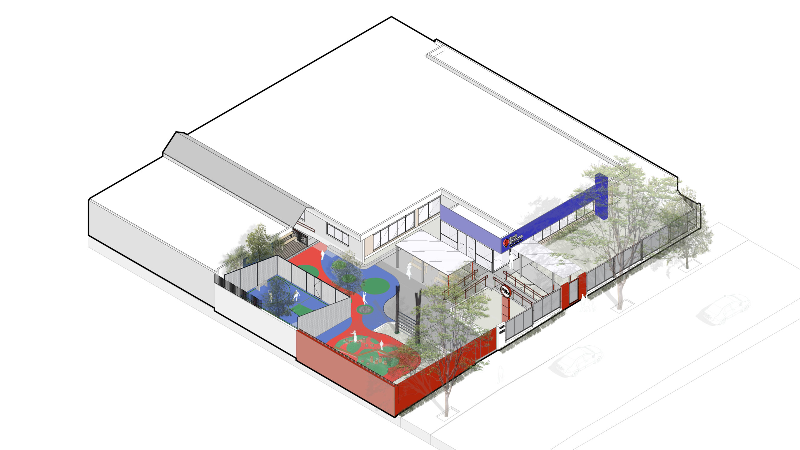 A parte do manual, a intenção foi reforçar a presença do gradil no meio urbano, o qual entendemos como o elemento de maior interação da escola com o ambiente público. Além de garantir segurança, foi pensado para criar um impacto visual positivo no entorno. Suas formas lúdicas e cores vibrantes refletem a proposta educacional da escola, atraindo a atenção e transmitindo uma imagem acolhedora e moderna. O paisagismo foi cuidadosamente planejado para integrar vegetação e elementos decorativos, criando um ambiente convidativo para alunos e visitantes.